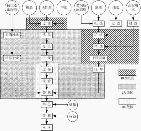 图2 无菌原料药精制、干燥、包装工艺流程框图及环境区域划分