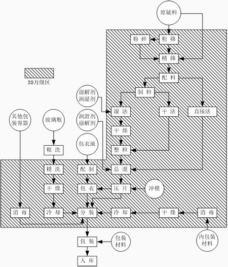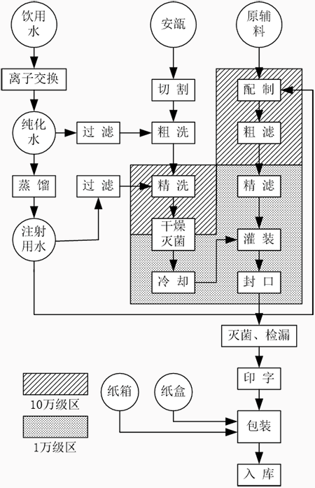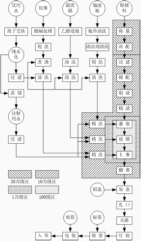 图7 可灭菌大容量注射剂生产工艺流程框图及环境区域划分