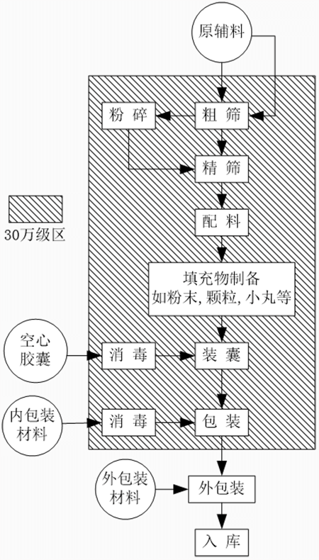 图4 硬胶囊剂生产工艺流程框图及环境区域划分