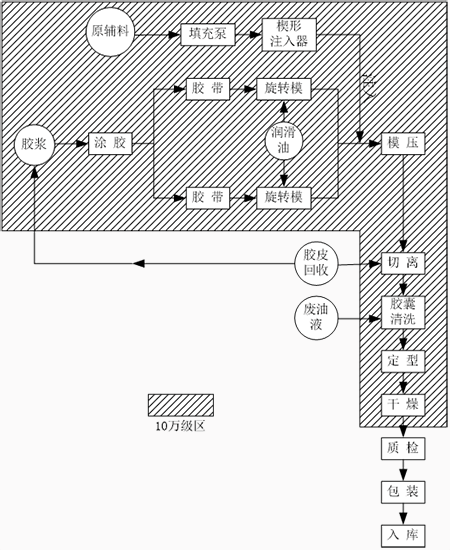 图5 压制法软胶囊剂生产工艺流程框图及环境区域划分