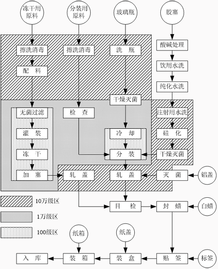 图8 注射用无菌分装产品生产工艺流程框图及环境区域划分